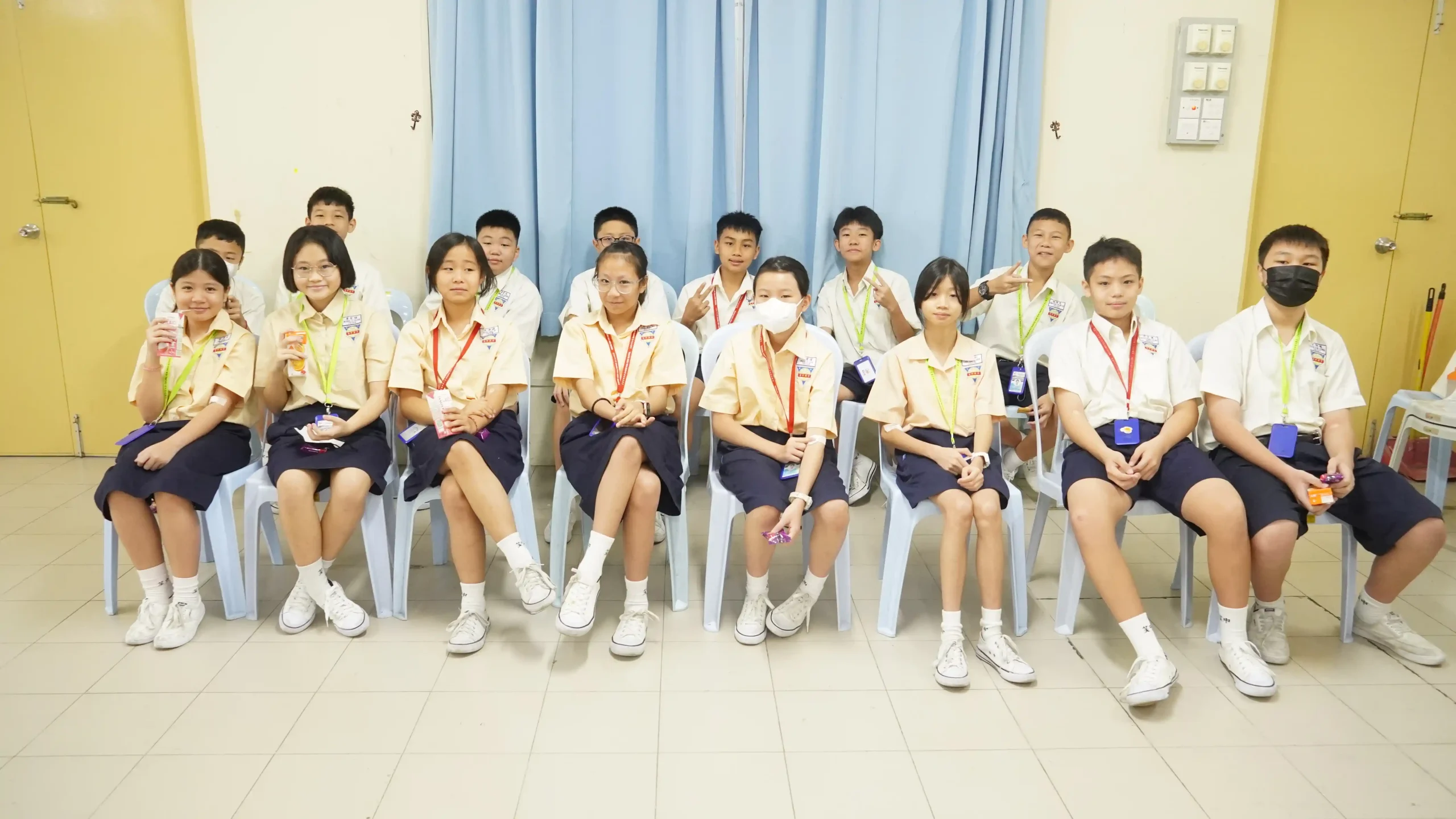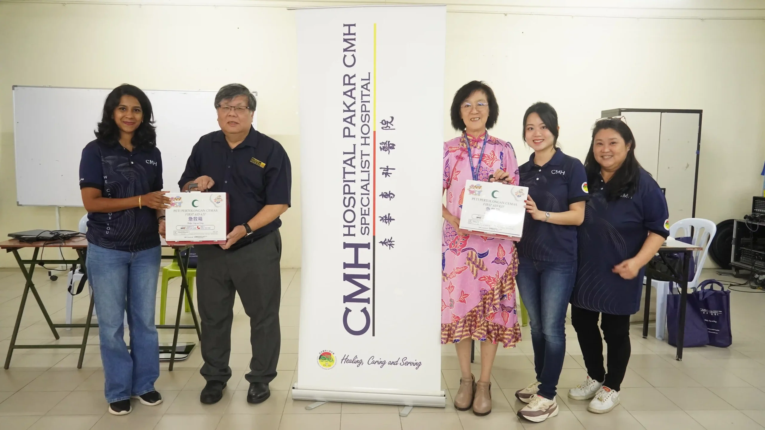 健康检查结束后,森华专科医院代表——市场部主管卓文乐、市场部助理经理美鲁及市场部职员李淑玲——亦赠送了两个急救医药箱给予校方。