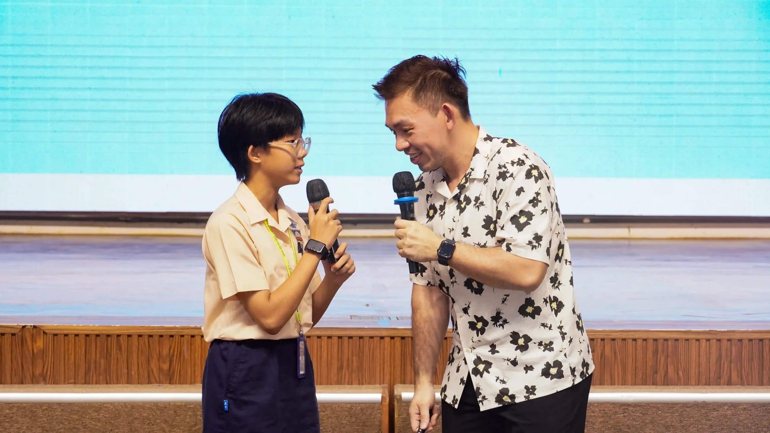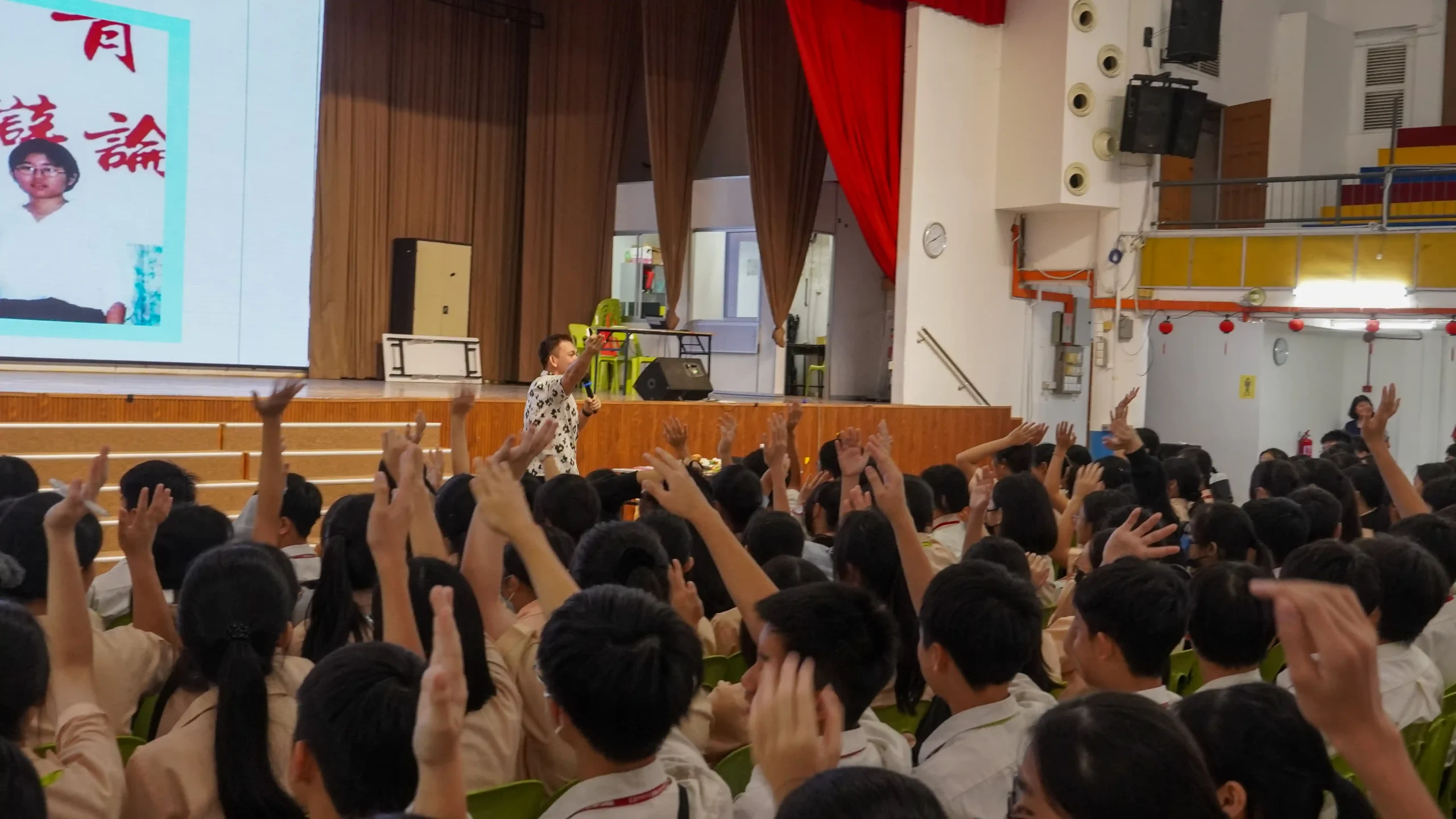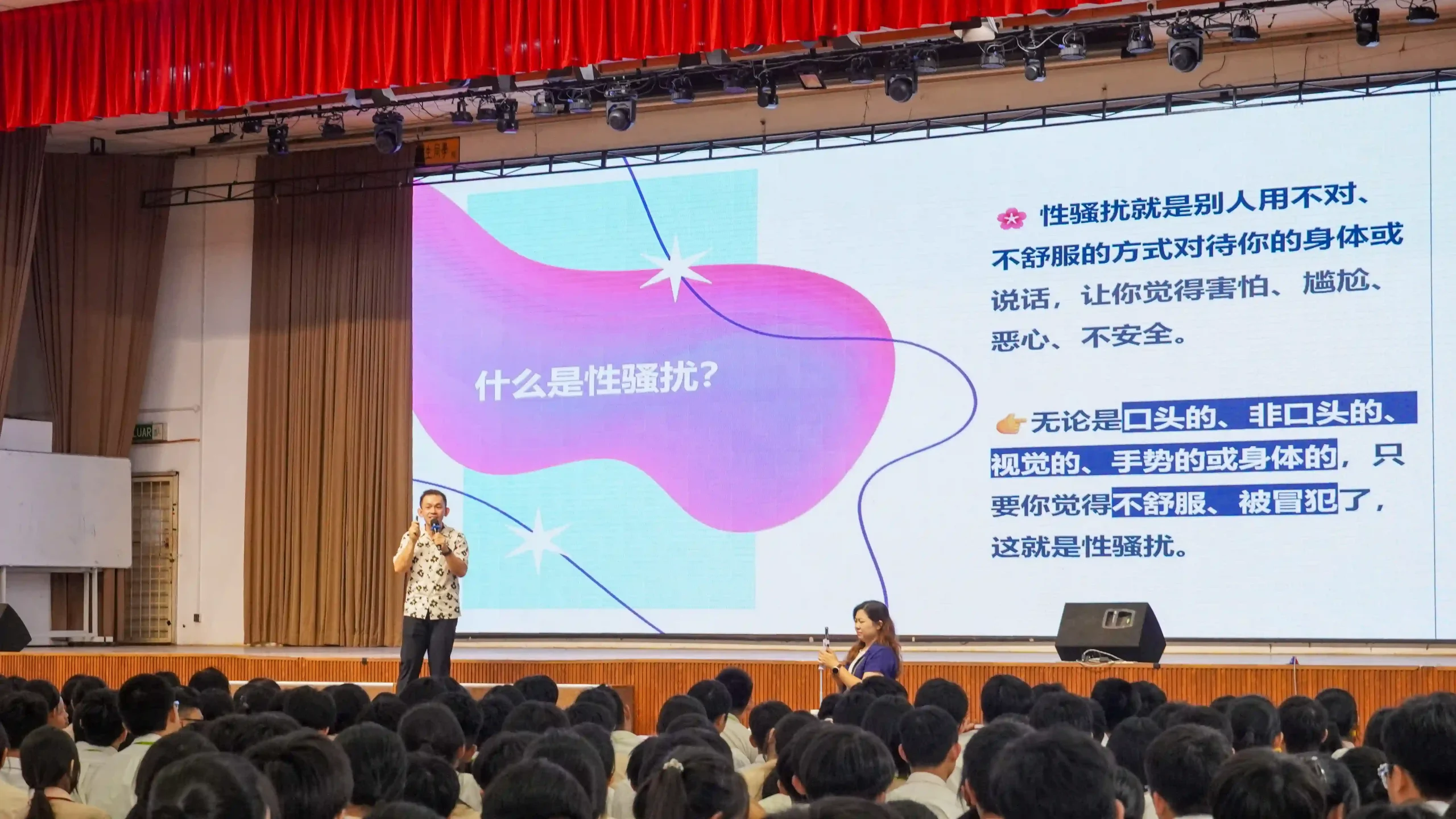 讲座尾声,陈律师透过情境模拟,引导学生分辨与应对校园中的不当行为,并鼓励大家勇敢发声、拒绝沉默。