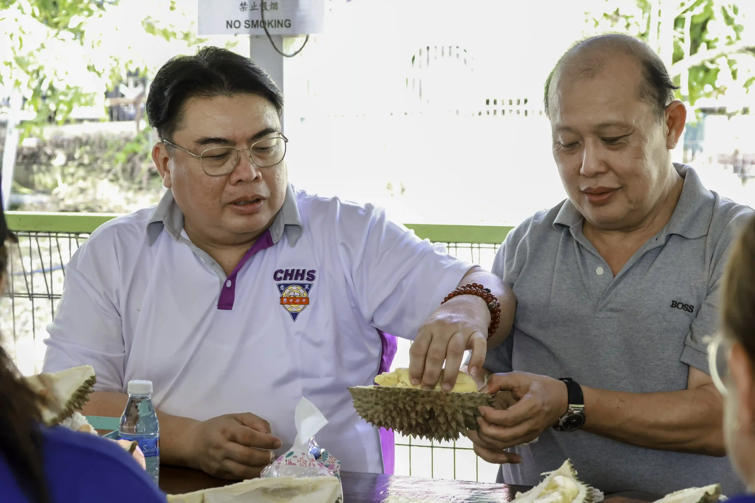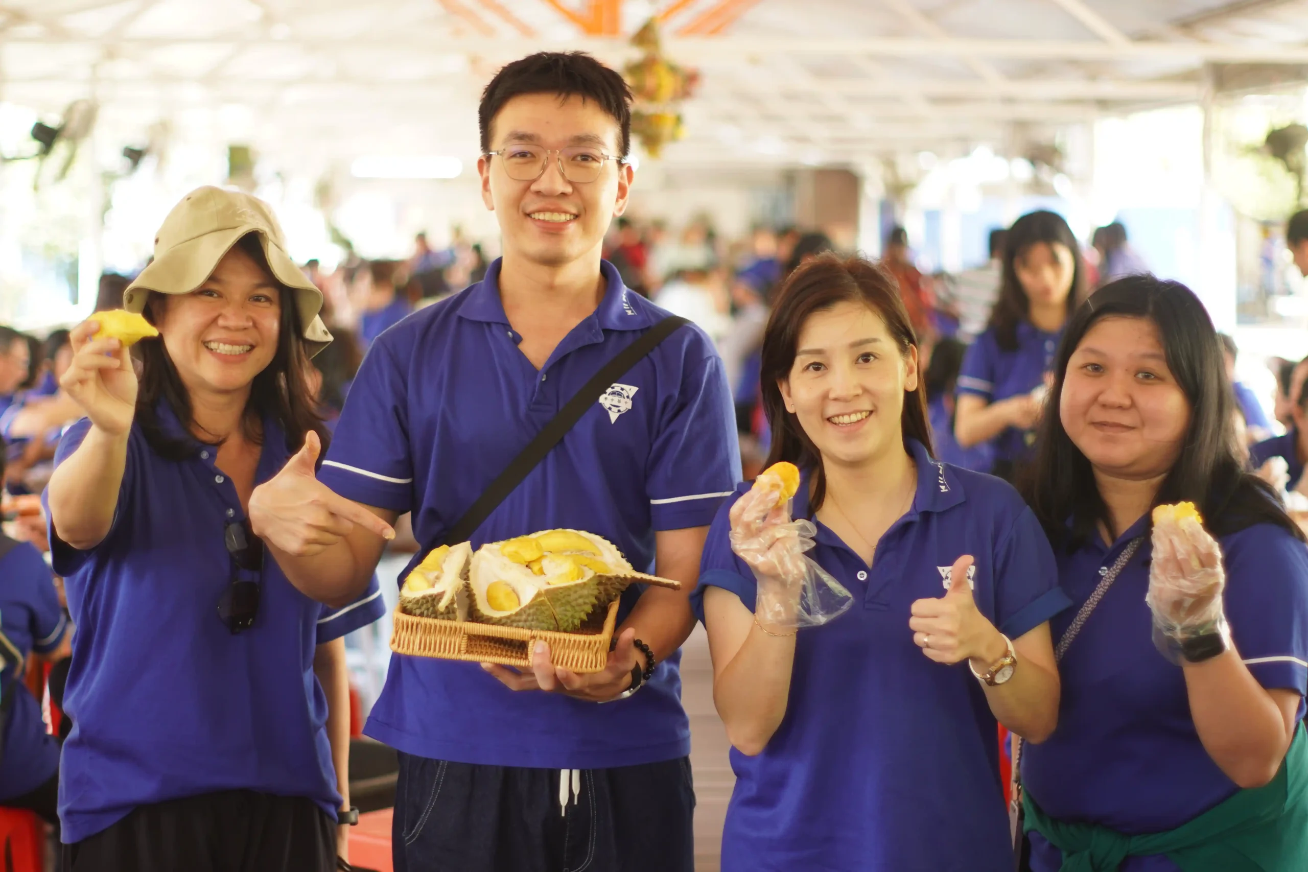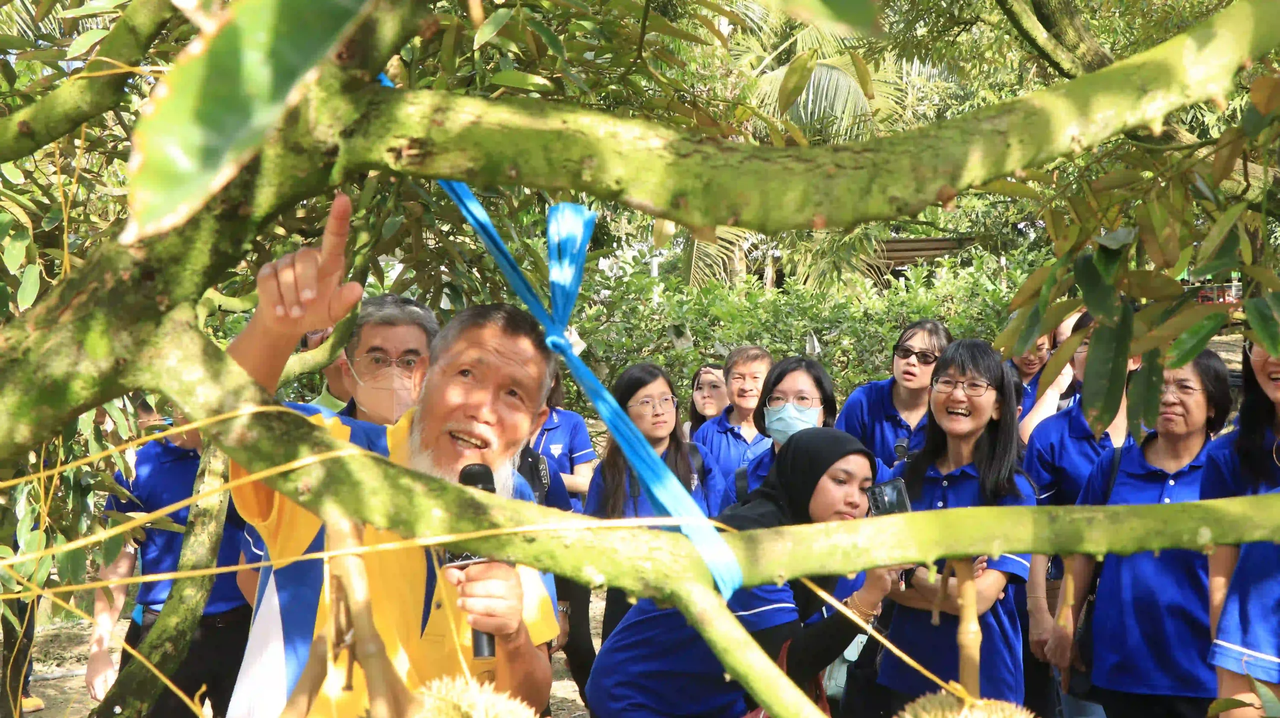 果园园主卢宇廷为芙中校友,此次特以地主之谊热情接待母校团队,盛情准备被誉为 “榴莲之王”的猫山王,以及有 “树上黄金”之称的黑刺,共300公斤的榴莲供大家品尝,其上乘的品质与浓郁的风味令现场众人赞不绝口。