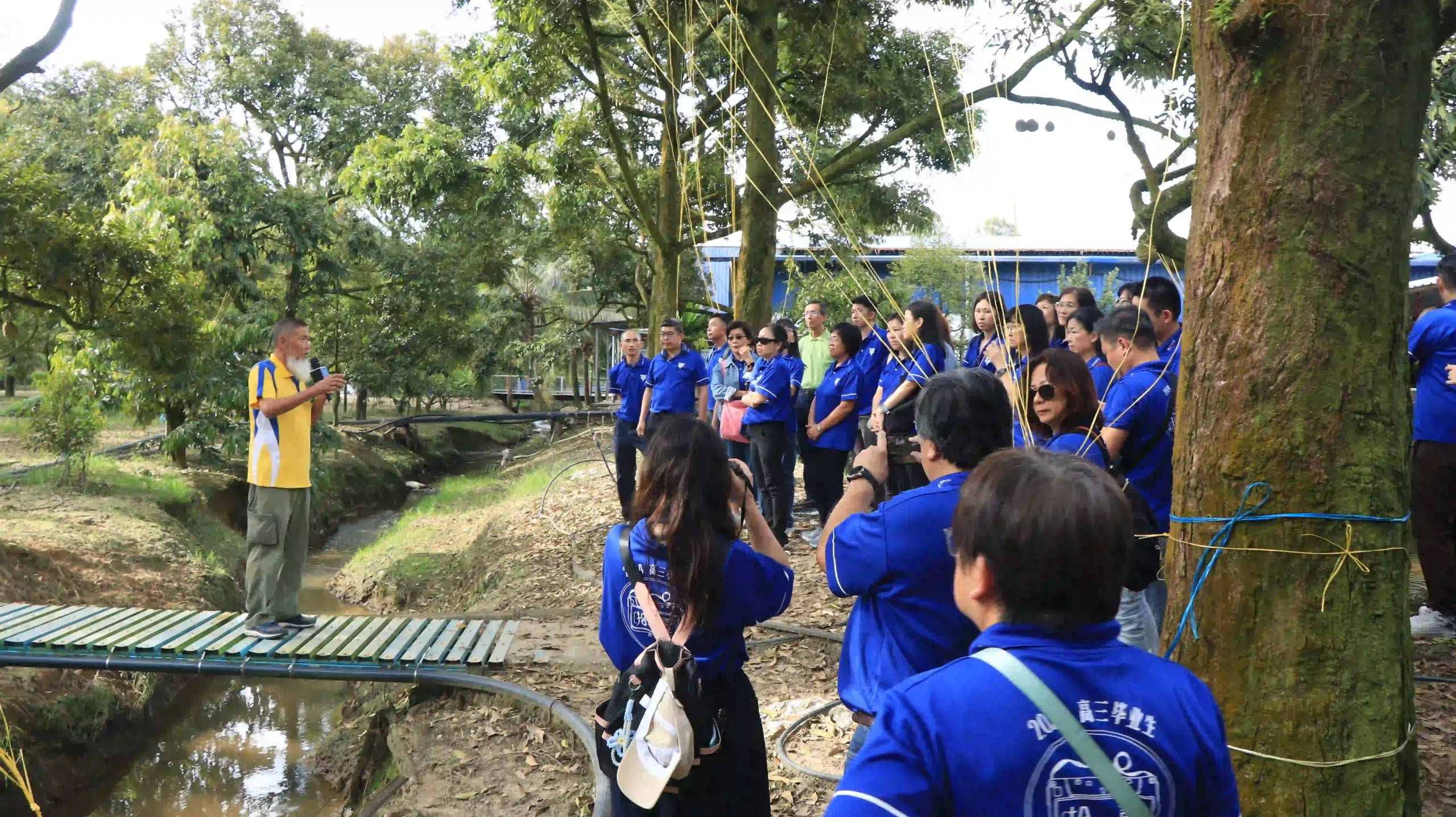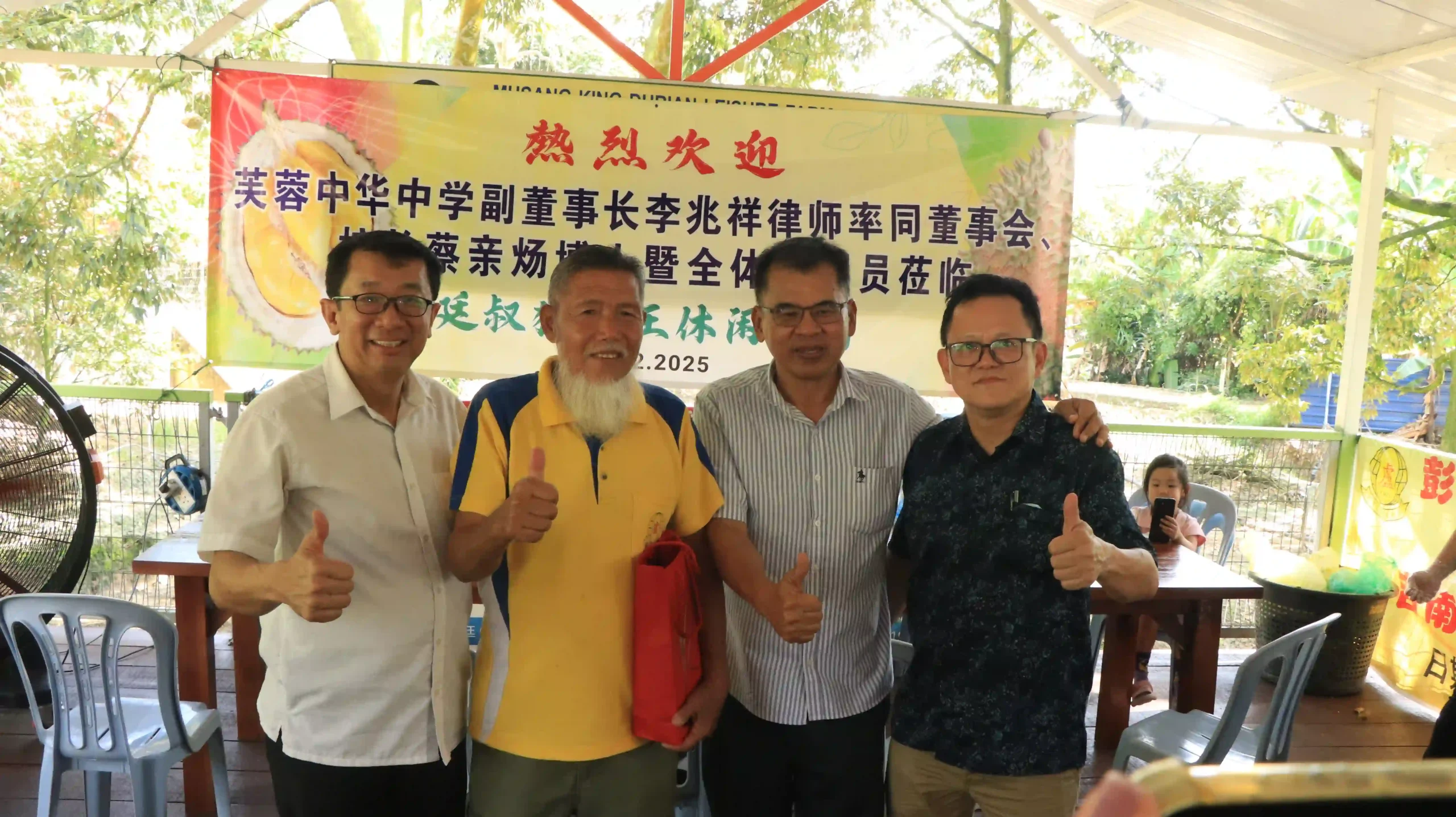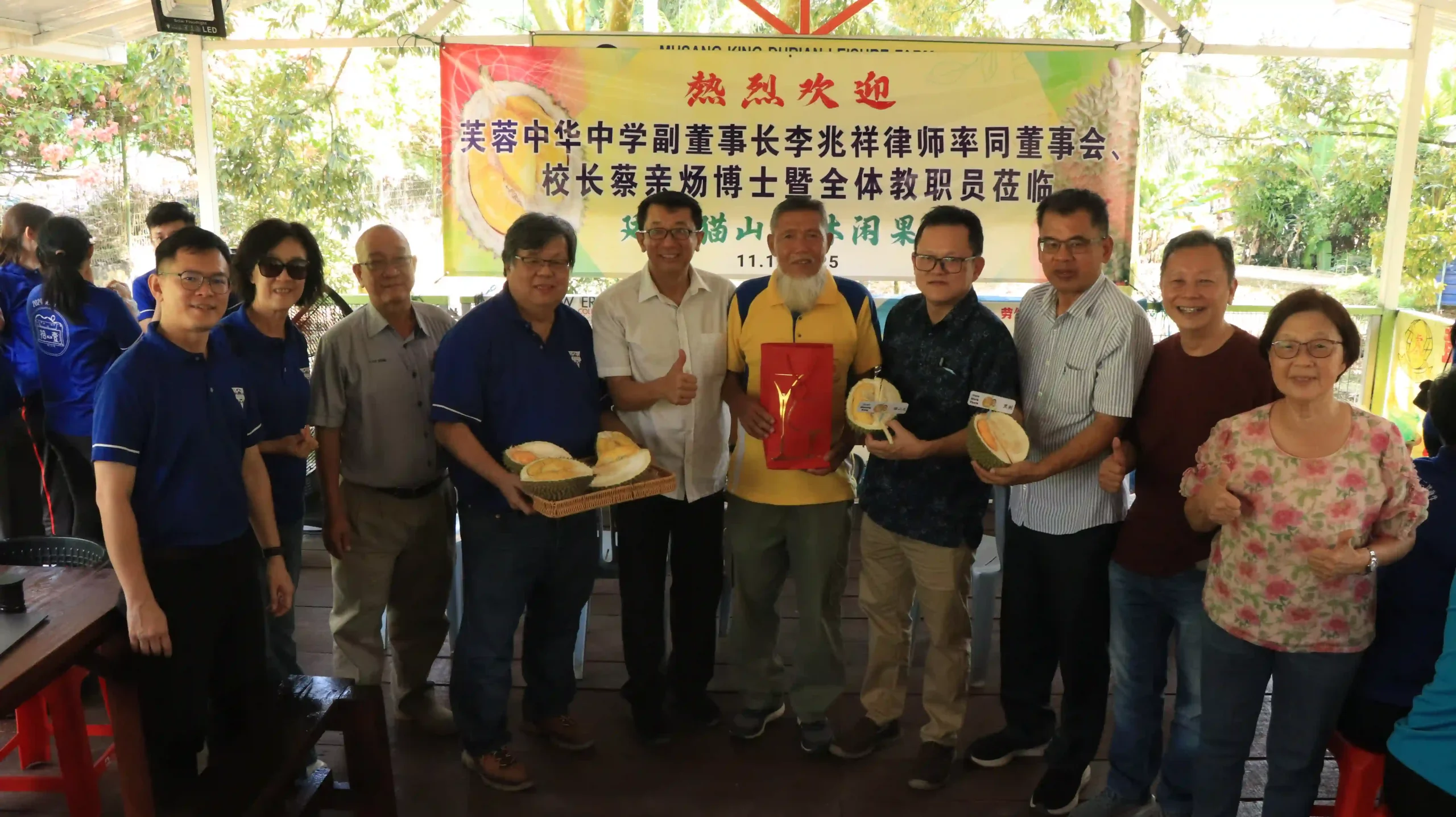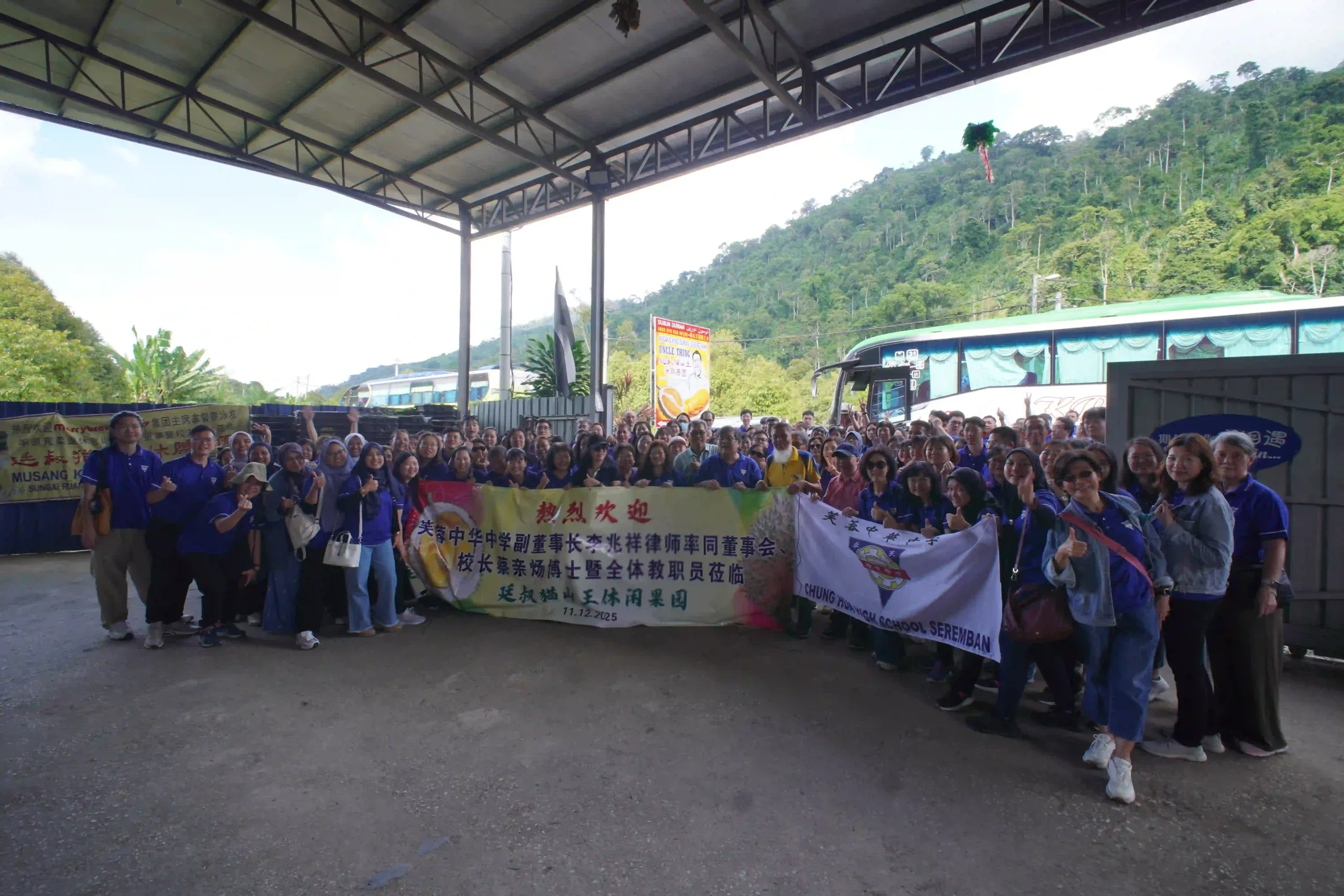 配合为期两天一夜的教职员户外培训活动,近200名芙蓉中华中学教职员与家长会成员,在副董事长李兆祥律师、总务萧福才、副总务陈元隆、董事张康华、吴小铭、陈清秀、王子敬等的陪同下,于12月11日前往彭亨劳勿双溪兰 (Sungai Ruan),参访当地有名的廷叔猫山王休闲果园。