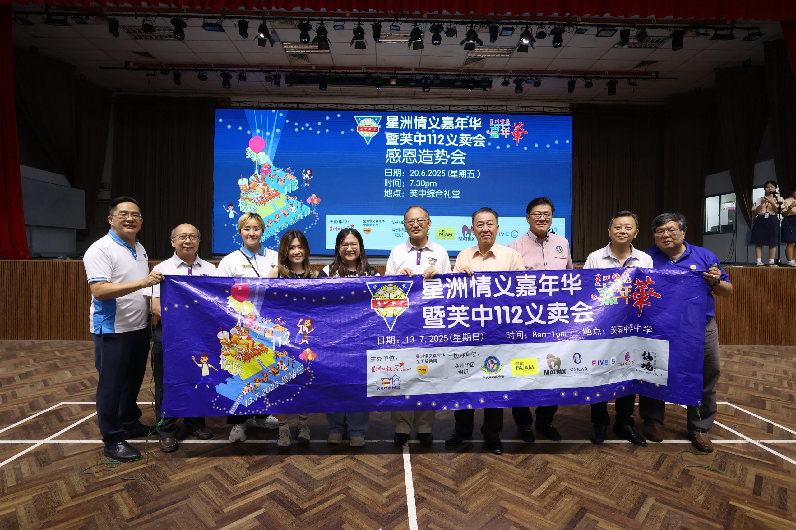 2025年6月20日,#星洲情义嘉年华暨芙中112周年义卖会感恩造势会 于芙中综合礼堂举行并圆满落幕。是项活动旨在为即将于7月13日举行的112周年校庆义卖会进行宣传与动员,并向长期支持芙中教育事业的社团、热心人士及企业表达诚挚谢意。